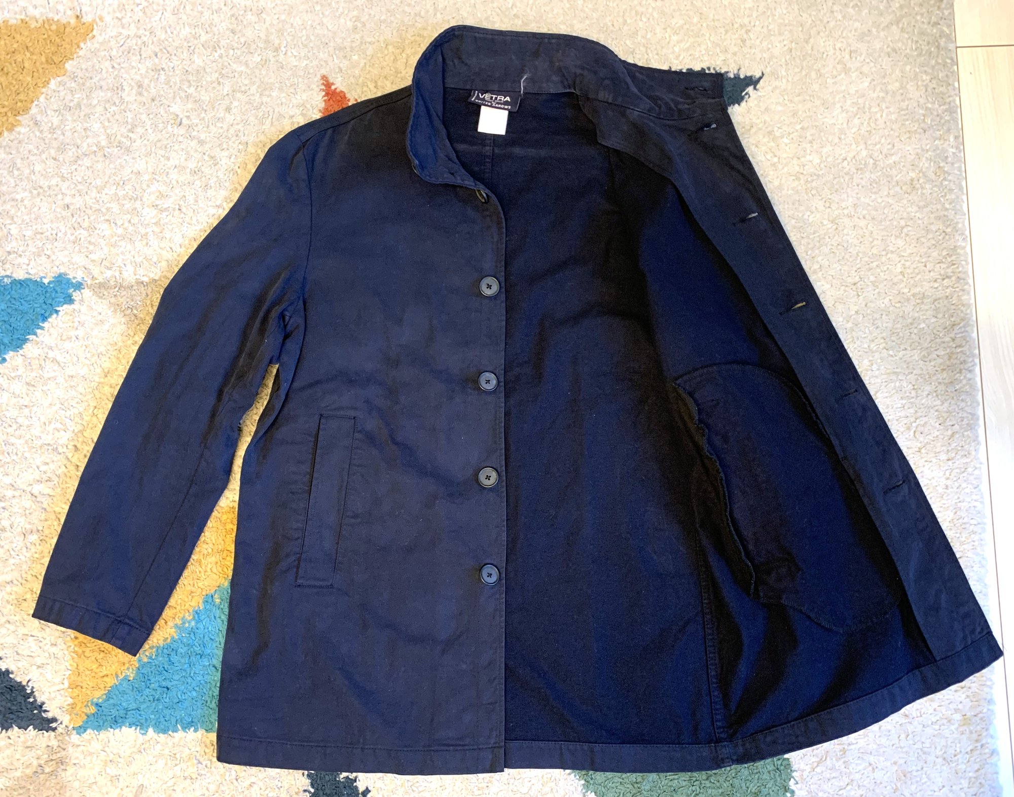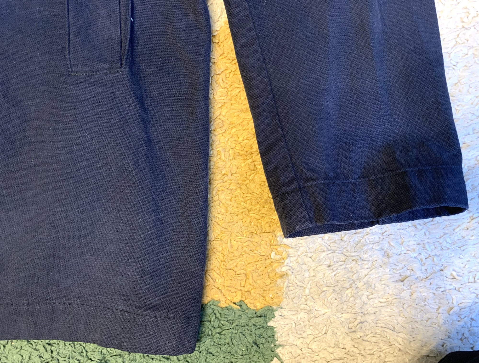 Size is labeled a 42 and fits a large well. I measure the chest at 22” / 56cm, shoulders at 18” / 48, length at 31” / 79cm and sleeves at 25” / 63cm from the shoulder. The jacket comes in lightly used, very good shape with no holes, tears or stains, just some fading on the neck tag. Made in France.