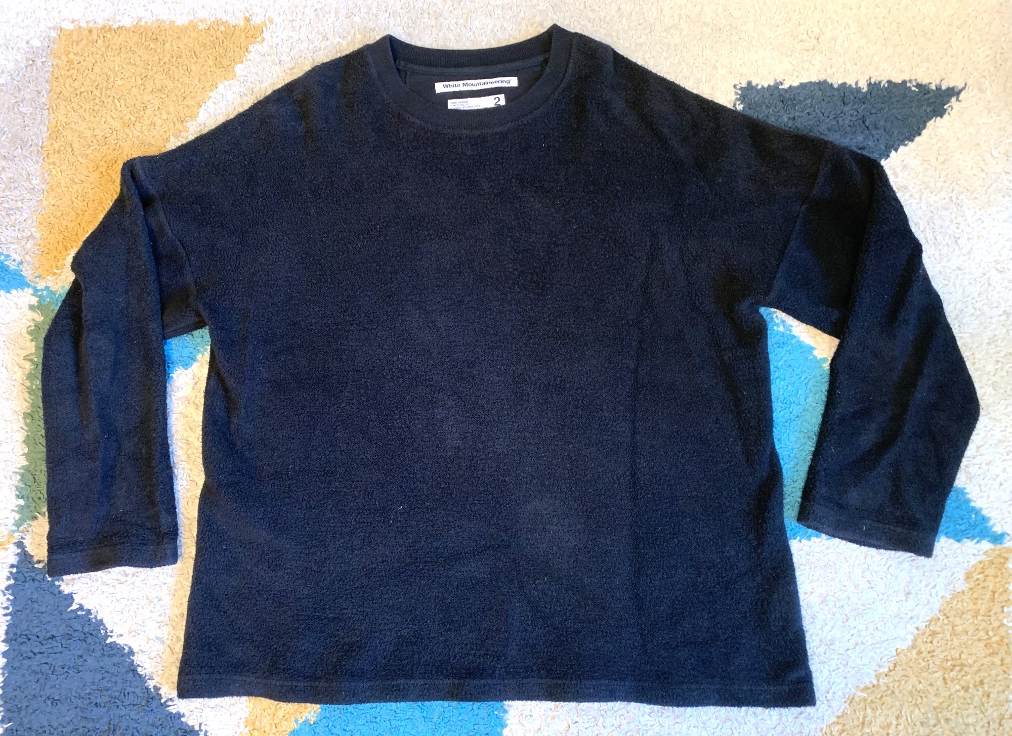 Size is labeled a 2 and fits relaxed as noted, working well for a large or extra large. I measure the chest at 25” / 64cm, shoulders at 21” / 53cm, length at 27” / 69cm from the base of the neck, and sleeves at 25” / 64cm from the shoulder. The sweater comes in lightly used, very good shape with no holes, tears or stains. Made in Japan.
