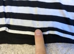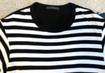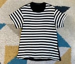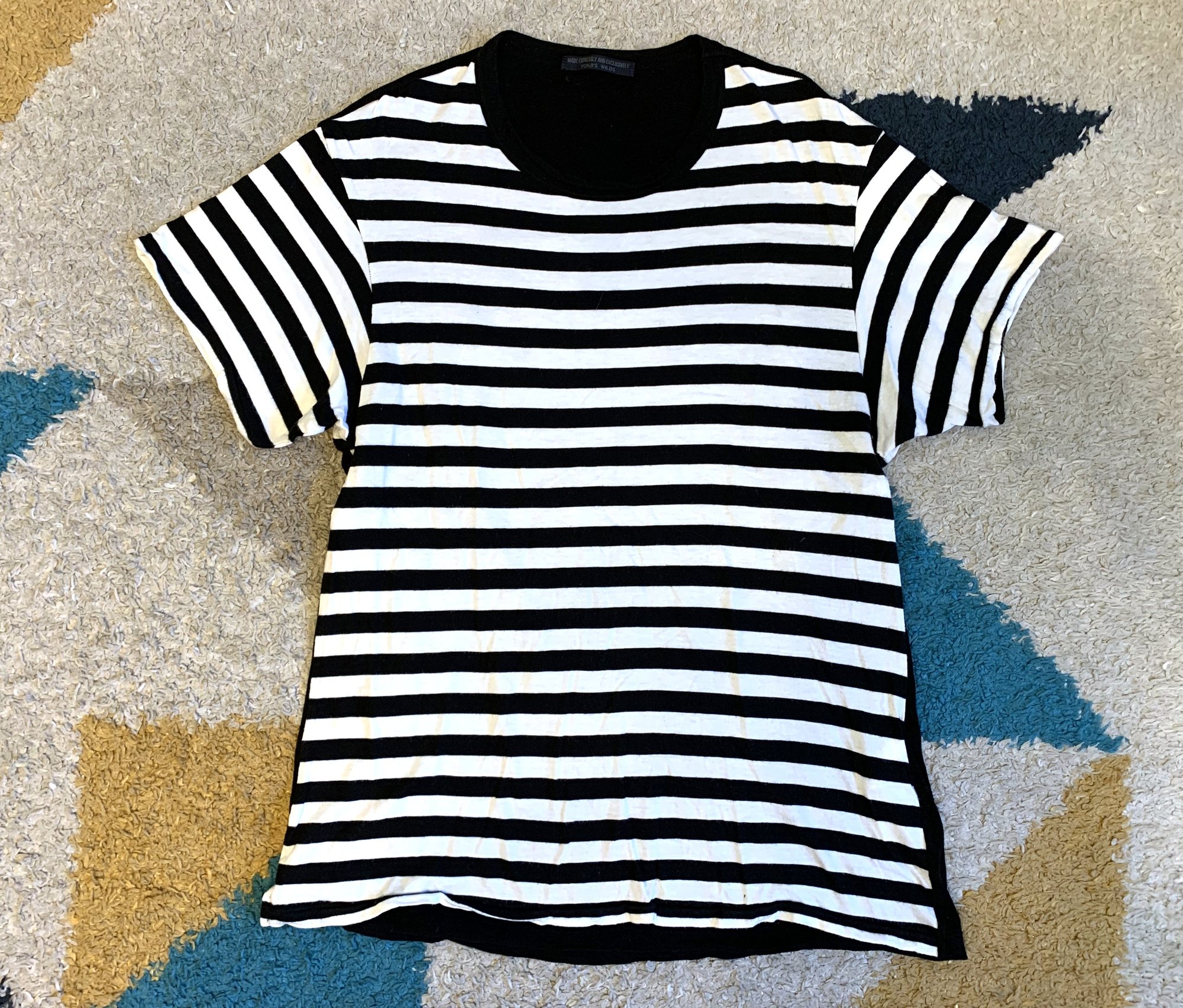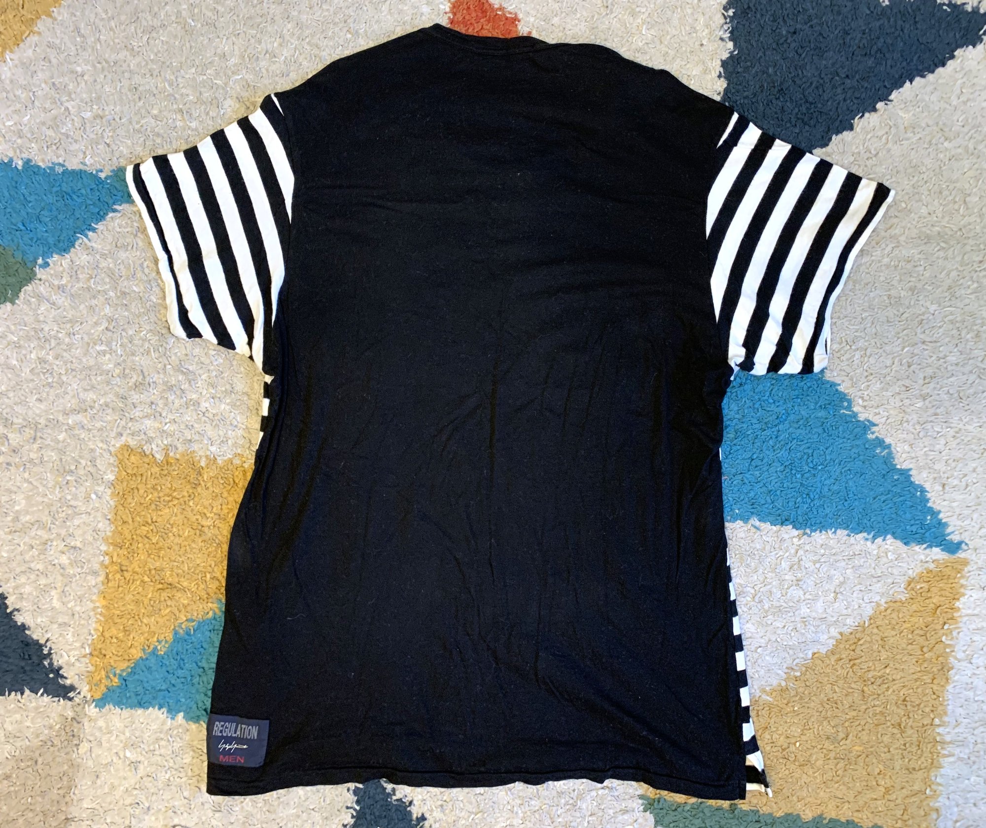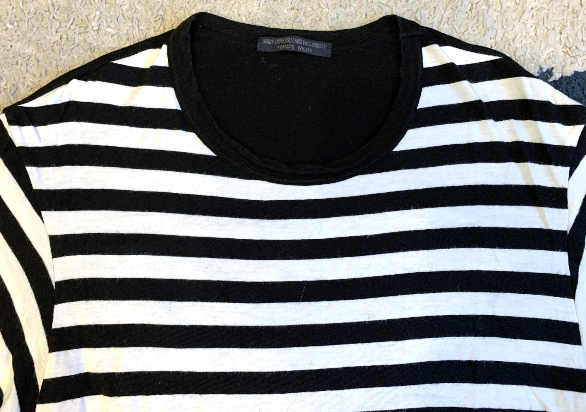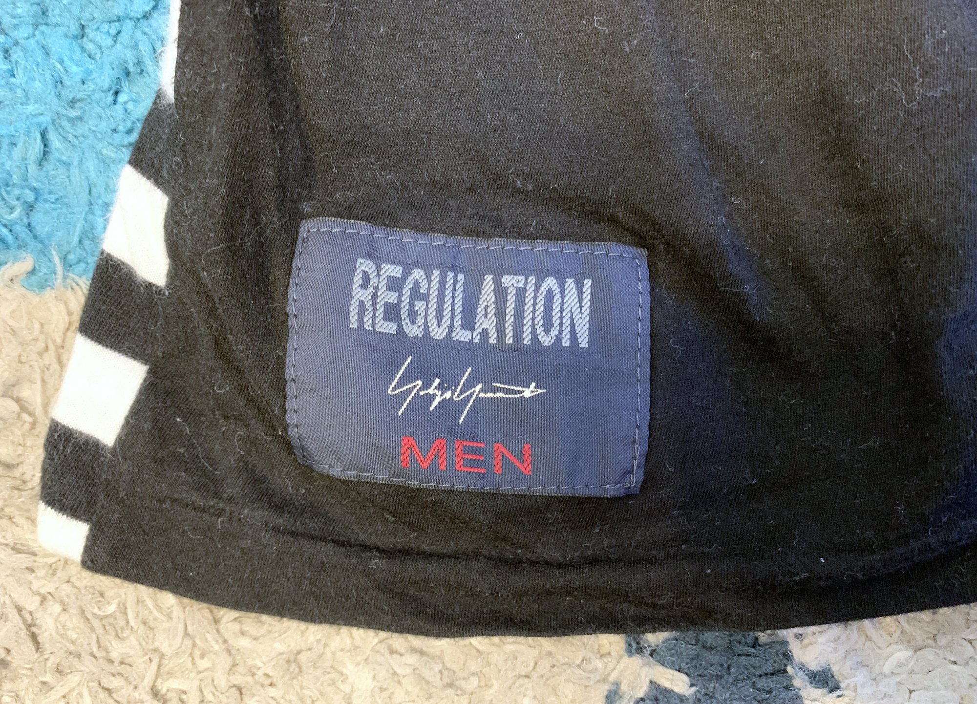 With all that said, this is Yohji’s take on the classic striped tee. Fabric is 50% cotton, 50% rayon. Front is done in a black and white stripe while the rear is a solid black. Silhouette is a bit more straightforward and fitted that a lot of other Yohji pieces, although the length is also a bit longer than normal for a tee. Rear features the Regulation tag, while the neckline has a different tag.